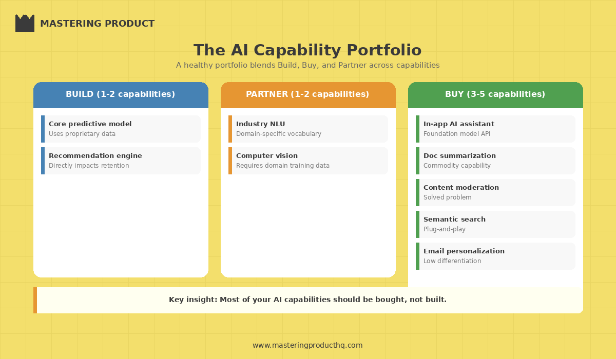 The key insight: most of your AI capabilities should be bought, not built. The buy category should always be the largest. Teams that try to build everything end up building nothing well.