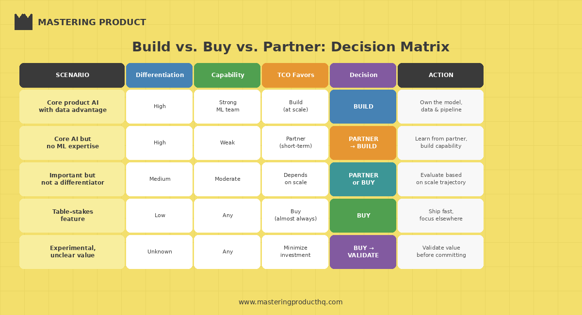 The last row is critical. When the strategic value of an AI capability is unclear, which is more often than teams admit start by buying. Use a third-party API to validate that the capability actually moves your product metrics before investing in building or partnering. This is the Discovery Sprint mindset applied to AI capabilities: validate before you commit.