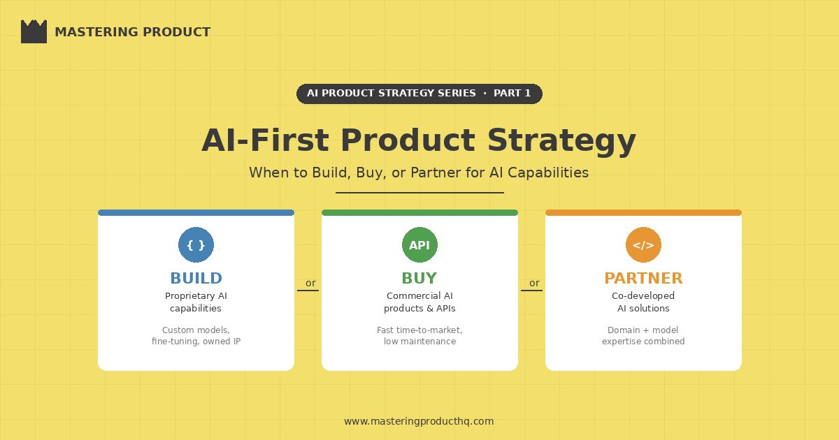 Welcome to this week’s edition of Mastering Product! This is Part 1 of my AI Product Strategy series. Today, I am addressing the question every product leader is facing right now: should you build your own AI capabilities, buy off-the-shelf solutions, or partner with specialized AI providers? The answer isn’t as straightforward as it seems, and getting it wrong can cost your company years of runway. I’ll walk you through a decision framework that cuts through the hype and helps you make this call with confidence. In Part 2, we’ll go deeper into the tactical side of building products on top of LLMs. Let’s get into it.